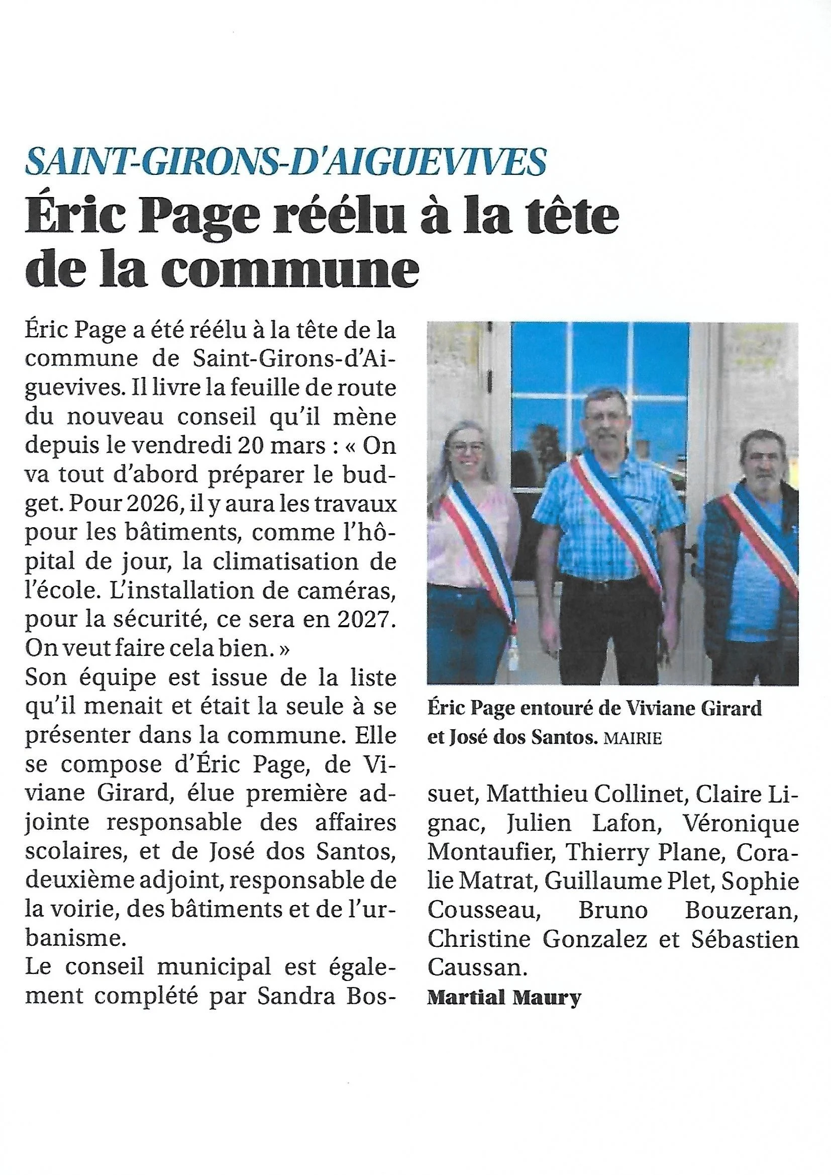Eric page reelu a la tete de la commune